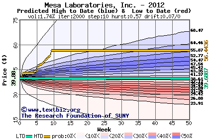 The high to date and low to date prices of the stock plotted against a random walk model for 2012 (what's this?).