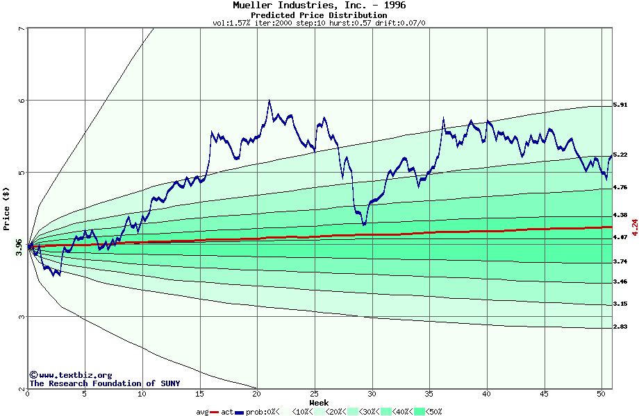 The following graph plots the year-to-date performance of the stock for 1996 compared to the probability calculated by a random walk model.