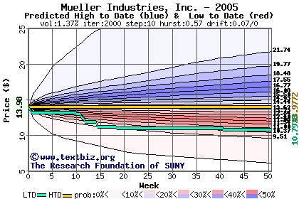 The high to date and low to date prices of the stock plotted against a random walk model for 2005 (what's this?).