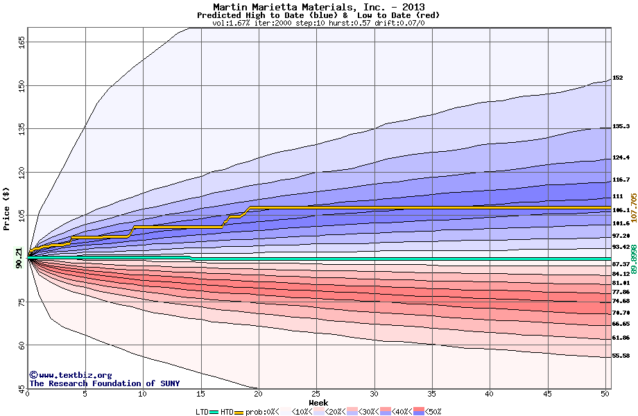 The high to date and low to date prices of the stock plotted against a random walk model for 2013 (what's this?).