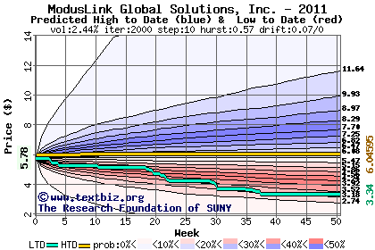 The high to date and low to date prices of the stock plotted against a random walk model for 2011 (what's this?).