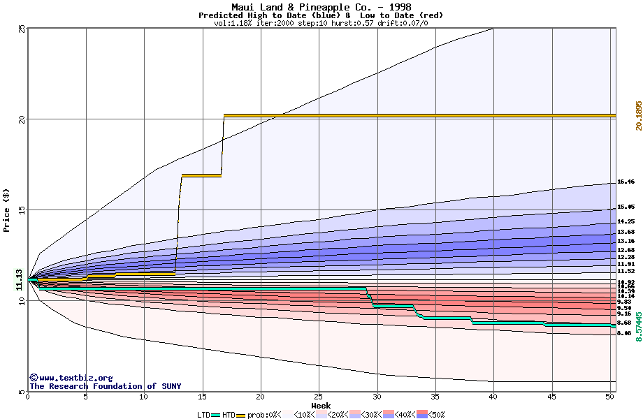 The high to date and low to date prices of the stock plotted against a random walk model for 1998 (what's this?).