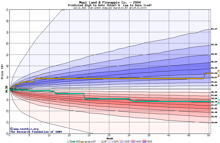 The high to date and low to date prices of the stock plotted against a random walk model for 2004 (what's this?).