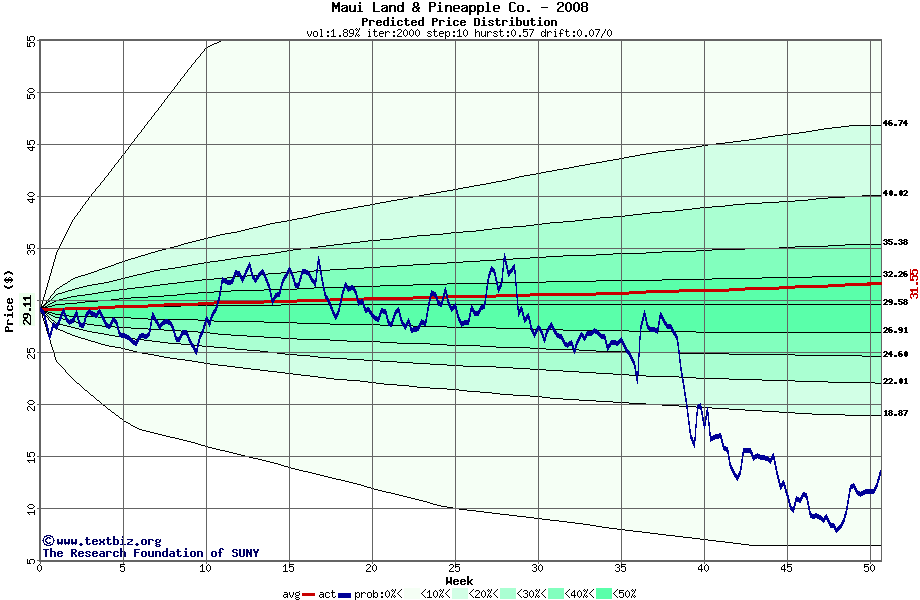 The following graph plots the year-to-date performance of the stock for 2008 compared to the probability calculated by a random walk model.