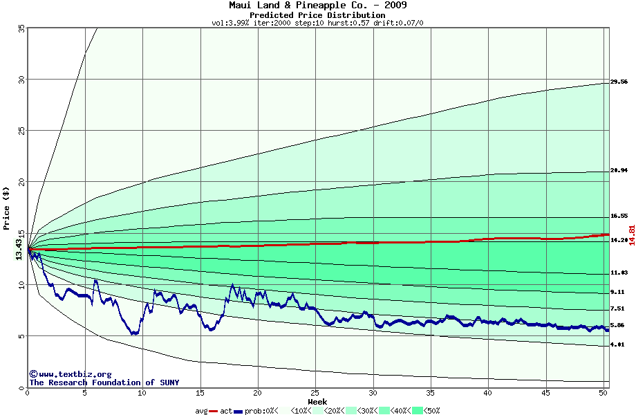 The following graph plots the year-to-date performance of the stock for 2009 compared to the probability calculated by a random walk model.