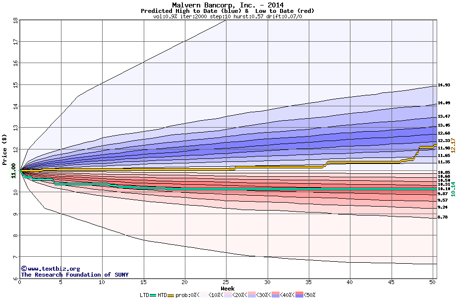 The high to date and low to date prices of the stock plotted against a random walk model for 2014 (what's this?).