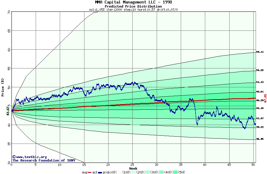 The following graph plots the year-to-date performance of the stock for 1998 compared to the probability calculated by a random walk model.