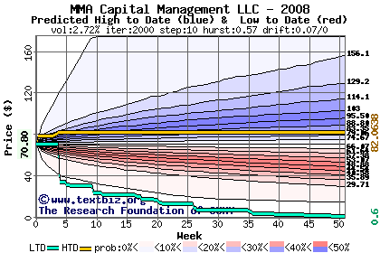 The high to date and low to date prices of the stock plotted against a random walk model for 2008 (what's this?).