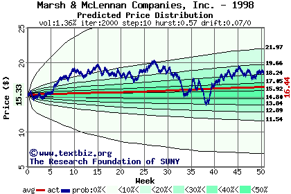 The high to date and low to date prices of the stock plotted against a random walk model for 1998 (what's this?).