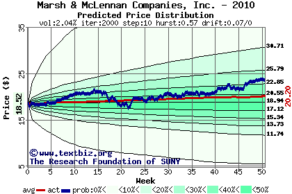 The high to date and low to date prices of the stock plotted against a random walk model for 2010 (what's this?).