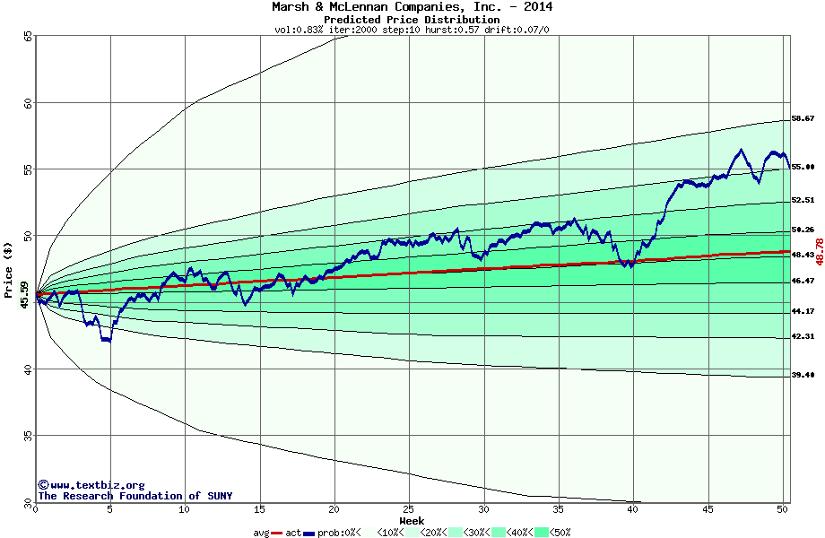 The following graph plots the year-to-date performance of the stock for 2014 compared to the probability calculated by a random walk model.
