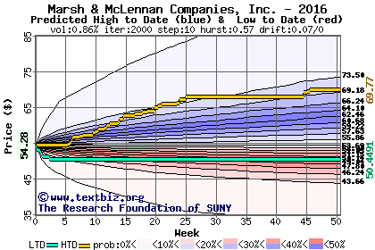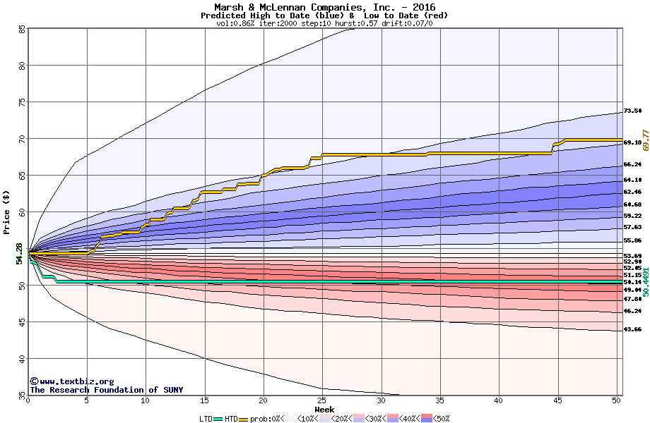 The high to date and low to date prices of the stock plotted against a random walk model for 2016 (what's this?).