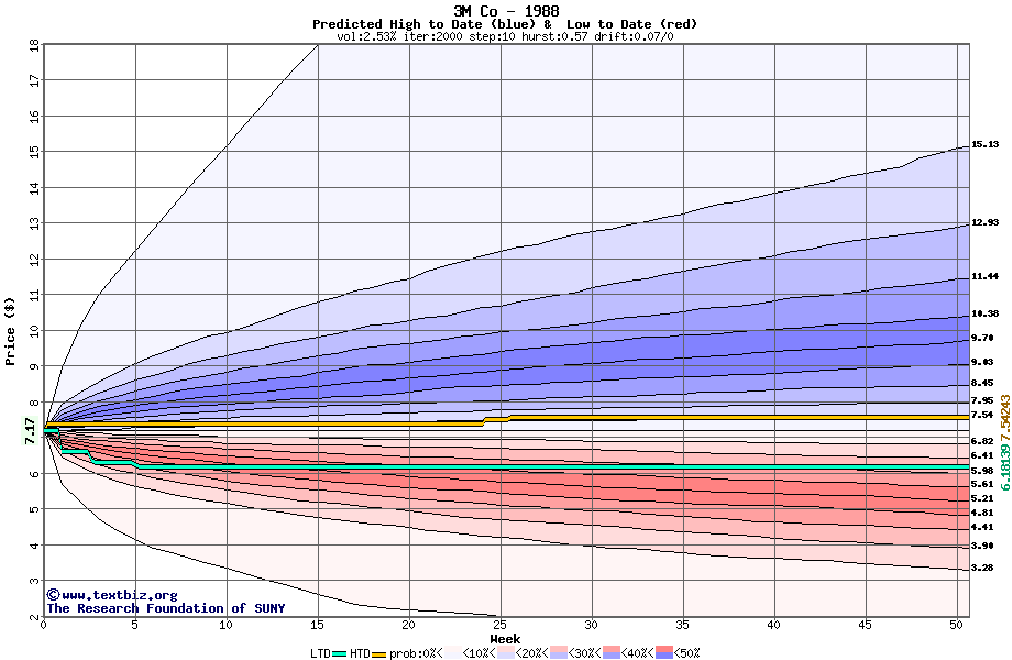 The high to date and low to date prices of the stock plotted against a random walk model for 1988 (what's this?).