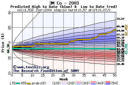 The high to date and low to date prices of the stock plotted against a random walk model for 2003 (what's this?).