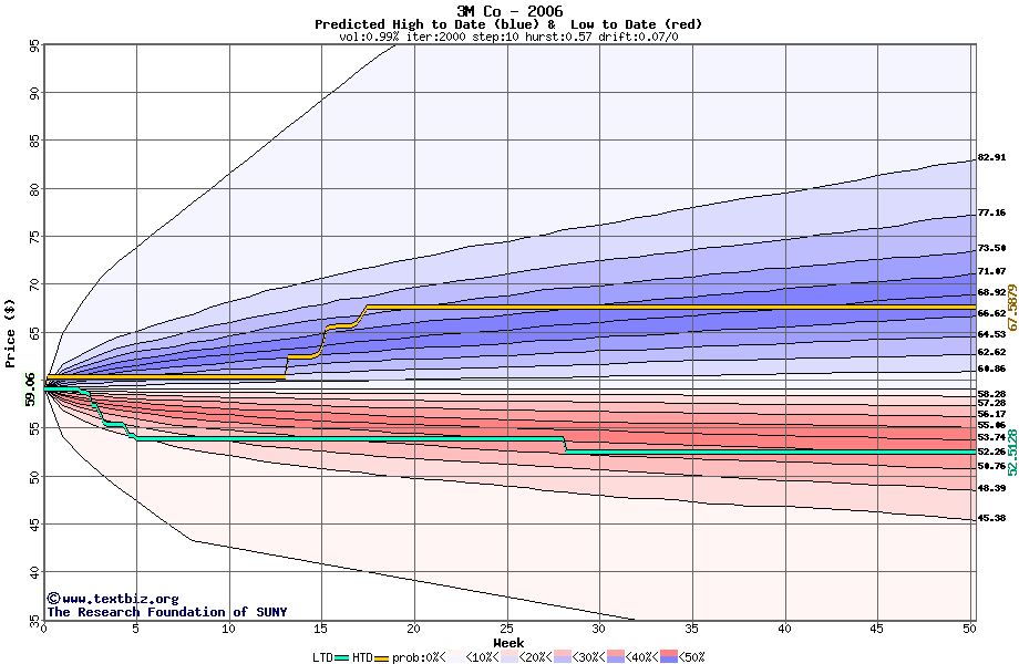The high to date and low to date prices of the stock plotted against a random walk model for 2006 (what's this?).