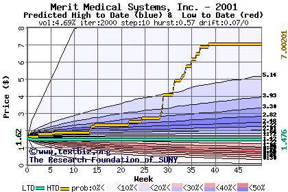 The high to date and low to date prices of the stock plotted against a random walk model for 2001 (what's this?).