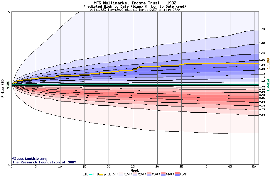 The high to date and low to date prices of the stock plotted against a random walk model for 1992 (what's this?).