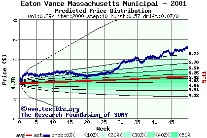 The high to date and low to date prices of the stock plotted against a random walk model for 2001 (what's this?).