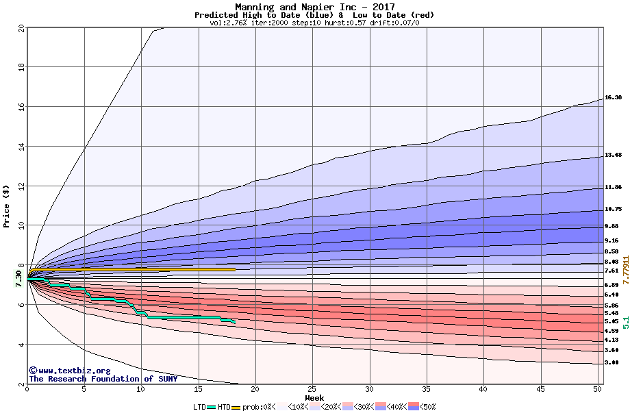 The high to date and low to date prices of the stock plotted against a random walk model for 2017 (what's this?).