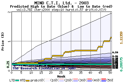 The high to date and low to date prices of the stock plotted against a random walk model for 2003 (what's this?).