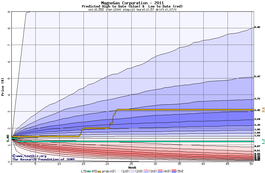 The high to date and low to date prices of the stock plotted against a random walk model for 2011 (what's this?).