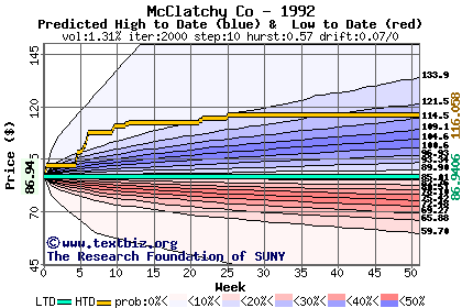 The high to date and low to date prices of the stock plotted against a random walk model for 1992 (what's this?).