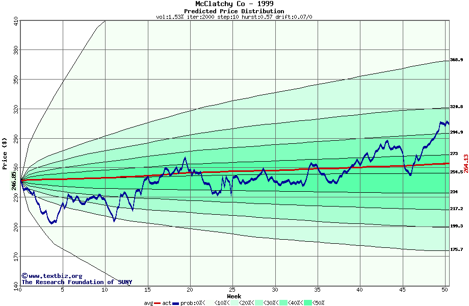 The following graph plots the year-to-date performance of the stock for 1999 compared to the probability calculated by a random walk model.