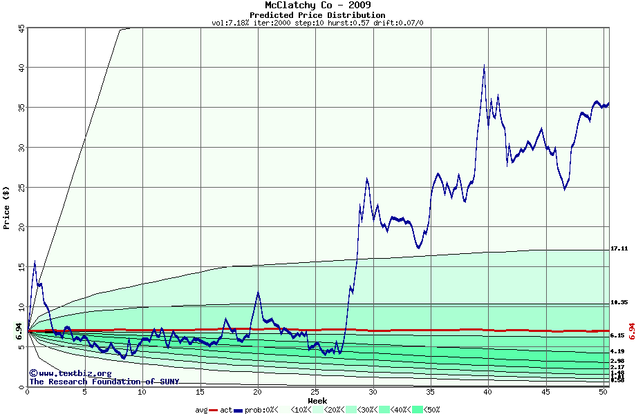 The high to date and low to date prices of the stock plotted against a random walk model for 2009 (what's this?).
