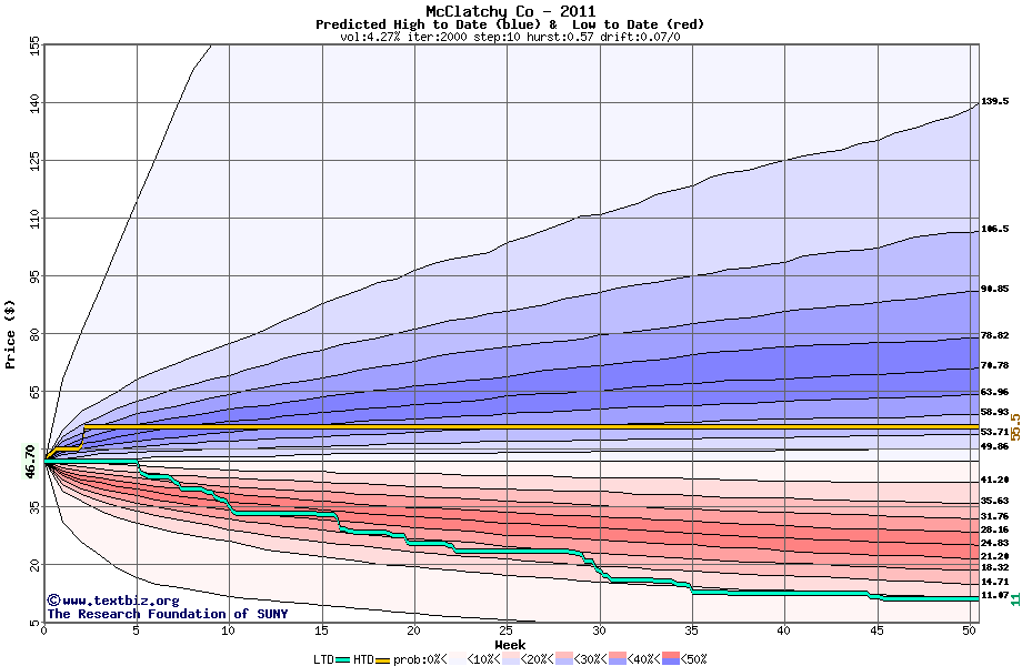 The high to date and low to date prices of the stock plotted against a random walk model for 2011 (what's this?).