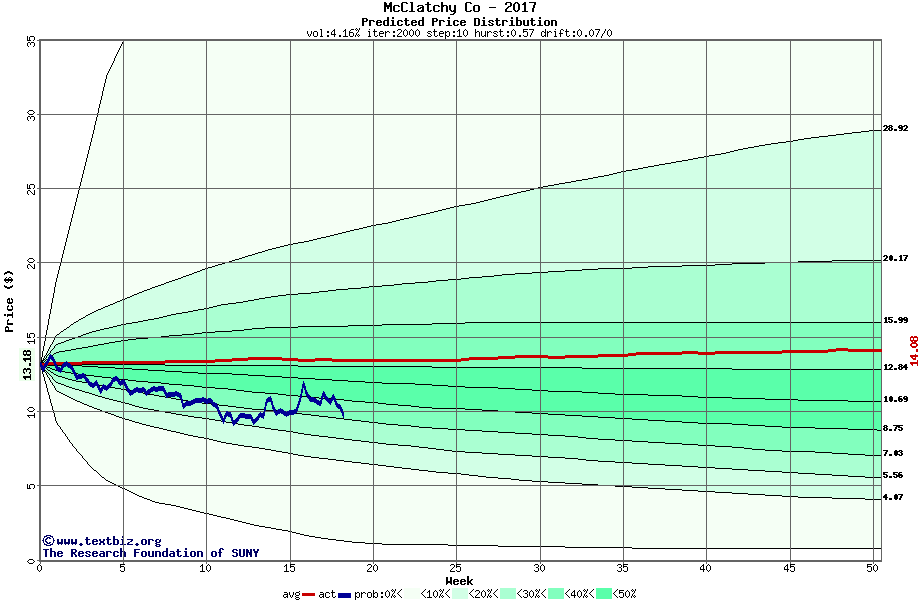 The high to date and low to date prices of the stock plotted against a random walk model for 2017 (what's this?).