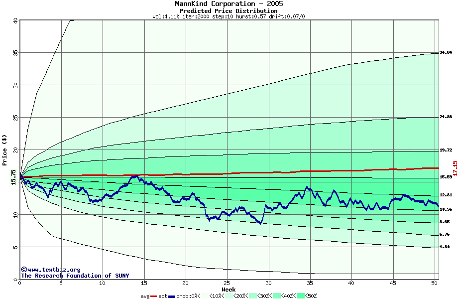 The following graph plots the year-to-date performance of the stock for 2005 compared to the probability calculated by a random walk model.