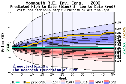 The high to date and low to date prices of the stock plotted against a random walk model for 2003 (what's this?).