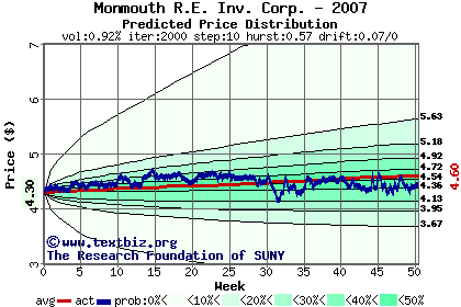 The high to date and low to date prices of the stock plotted against a random walk model for 2007 (what's this?).