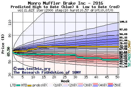 The high to date and low to date prices of the stock plotted against a random walk model for 2016 (what's this?).