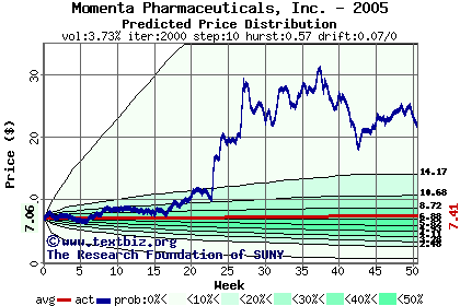 The following graph plots the year-to-date performance of the stock for 2005 compared to the probability calculated by a random walk model.