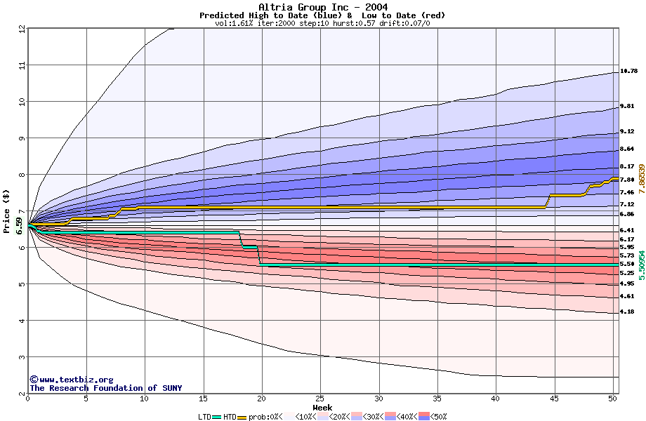 The high to date and low to date prices of the stock plotted against a random walk model for 2004 (what's this?).