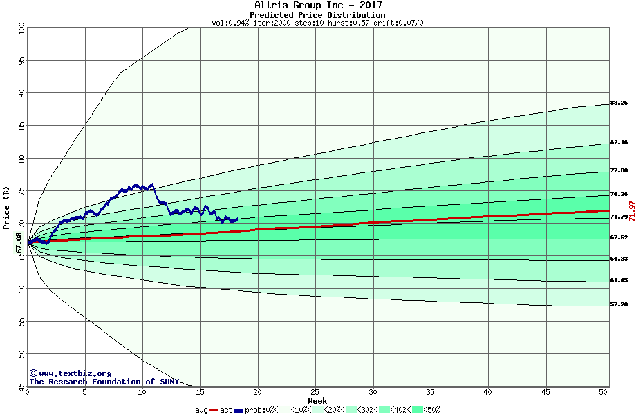 The following graph plots the year-to-date performance of the stock for 2017 compared to the probability calculated by a random walk model.