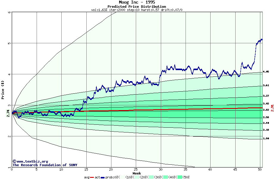 The following graph plots the year-to-date performance of the stock for 1995 compared to the probability calculated by a random walk model.