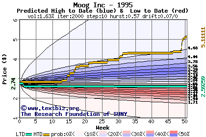 The high to date and low to date prices of the stock plotted against a random walk model for 1995 (what's this?).