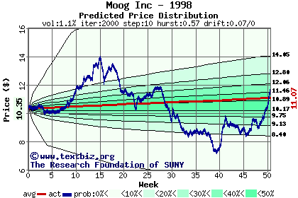 The high to date and low to date prices of the stock plotted against a random walk model for 1998 (what's this?).