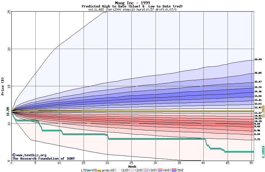 The high to date and low to date prices of the stock plotted against a random walk model for 1999 (what's this?).