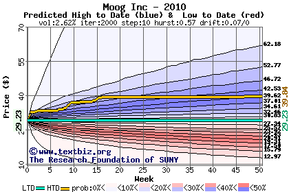 The high to date and low to date prices of the stock plotted against a random walk model for 2010 (what's this?).