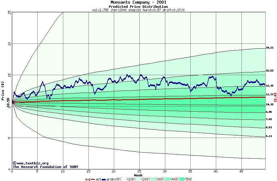 The following graph plots the year-to-date performance of the stock for 2001 compared to the probability calculated by a random walk model.