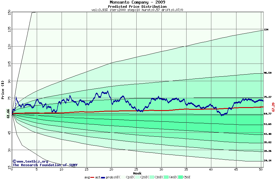 The following graph plots the year-to-date performance of the stock for 2009 compared to the probability calculated by a random walk model.