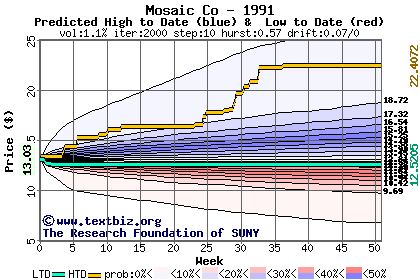The high to date and low to date prices of the stock plotted against a random walk model for 1991 (what's this?).