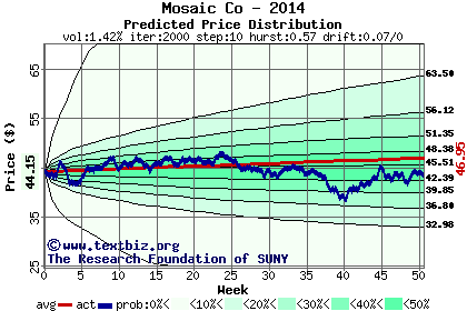 The high to date and low to date prices of the stock plotted against a random walk model for 2014 (what's this?).