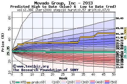 The high to date and low to date prices of the stock plotted against a random walk model for 2013 (what's this?).