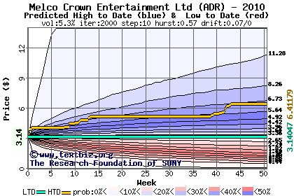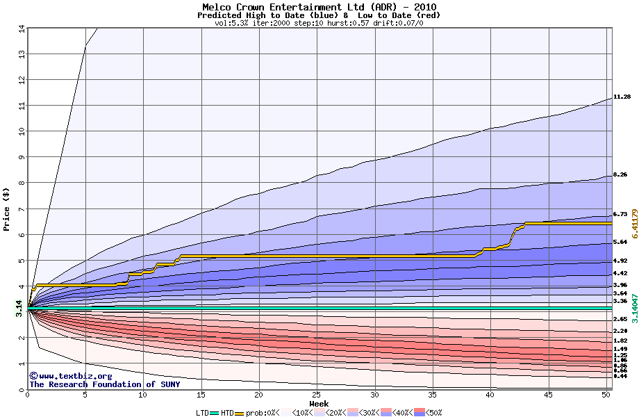The high to date and low to date prices of the stock plotted against a random walk model for 2010 (what's this?).