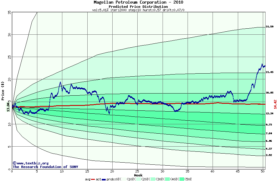 The following graph plots the year-to-date performance of the stock for 2010 compared to the probability calculated by a random walk model.
