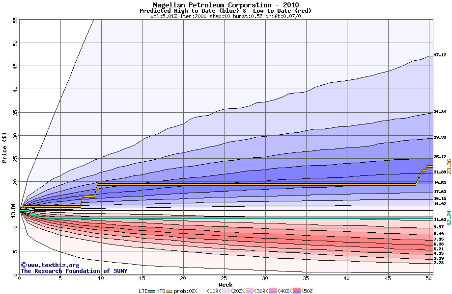 The high to date and low to date prices of the stock plotted against a random walk model for 2010 (what's this?).